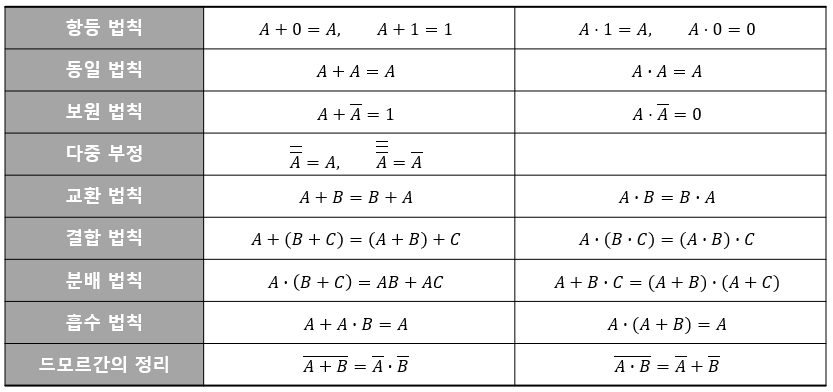 부울 대수의 정리와 법칙을 아래 표에 정리해두었다.